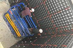 Zunächst wird die bei uns im Werk bereits vor konfektionierte Betonschutzplatte an den Wänden installiert. Sollte der Untergrund starke Unebenheiten aufweisen, können entsprechende Distanzhalter zwischen Untergrund und Betonschutzplatte angebracht werden, damit die Schalung nicht partiell zu nah in die Wand gezogen wird .